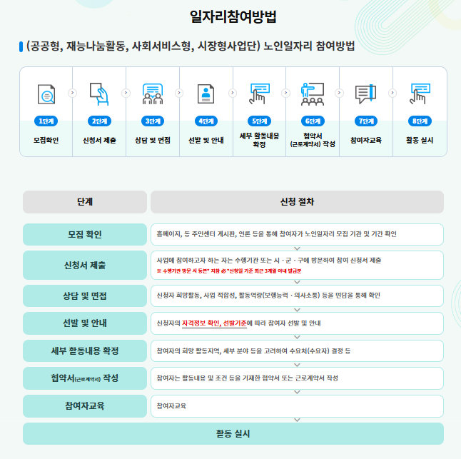 - 온라인 신청: 노인일자리 여기, 복지로, 정부24 사이트에서 지역별 모집 공고를 확인하고 신청할 수 있습니다.